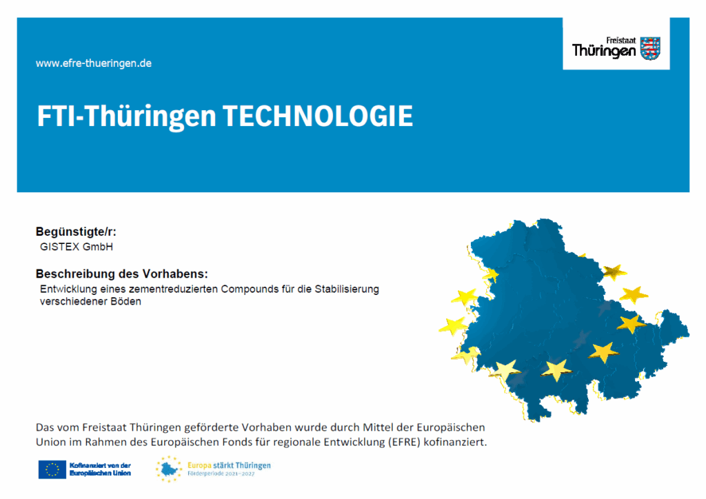 Bereits seit Anfang dieses Jahres wird die Gistex GmbH vom Land Thüringen gefördert: gemeinsam mit zahlreichen Wissenschaftlern werden Methoden entwickelt, um die anspruchsvollen thüringer Böden mithilfe ökologisch unbedenklicher Gistex-Additive besser verdichten zu können. Das Ziel: Den Straßenbau in Thüringen schneller und preiswerter zu machen.